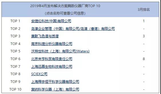 北京來(lái)亨在3月榜單中排名第8位,此次上升至第6位。其余新上榜的公司分別是上海遠(yuǎn)慕生物、SCIEX公司、上海舜宇恒平、復(fù)納科學(xué)儀器。