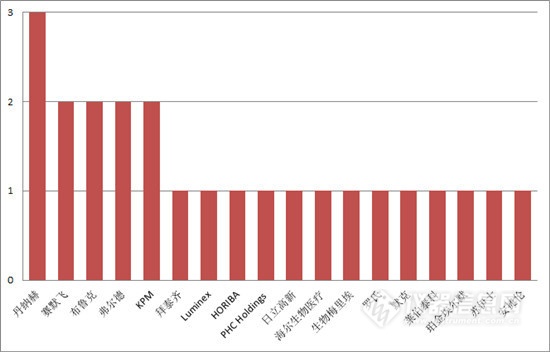 從領域上看,并購交易主要集中在生命科學領域,總計達到11筆;分析儀器次之,交易數(shù)量累計7筆。上半年,丹納赫集團(含貝克曼庫爾特)的收購數(shù)量暫時領先。進口品牌仍是資本市場的主導者,但萊伯泰科、海爾生物醫(yī)療等國產企業(yè)也有不俗表現(xiàn)。